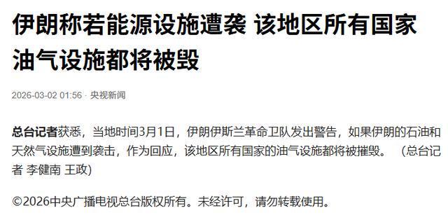 3 月 1 日,伊朗伊斯兰革命卫队公开发出重磅警告:如果伊朗本国的石油和天然气设施遭到袭击,作为回应,该地区所有国家的油气设施都将被摧毁。